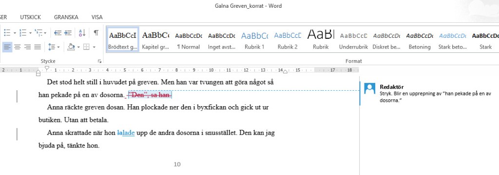 En ”kill your darling” vill Johan att jag ska ta bort. Jag hade fruktat att det skulle bli fler. Det han vill att jag ska ta bort var roligt att skriva, men jag inser att han har rätt så det ryker. Övrigt som han inte tycker leder berättelsen framåt försvinner också. Det var mest bara utfyllnad av mig. Strykningarna har gjorts. Nu återstår att skriva om och lägga till efter Johans förslag.