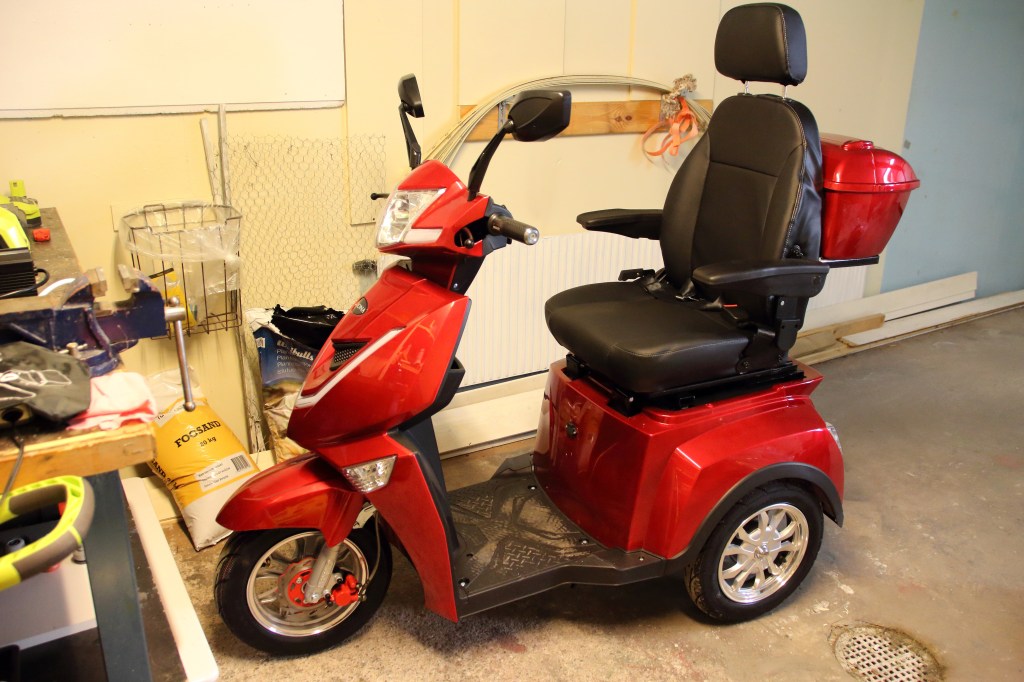 Jag får inte längre köra bil, men hoppas att jag får använda bilen igen i vinter. I väntan på det har jag köpt en trehjulig elmoped, som är rolig att köra. Jag kan nu köra till centrum med min Leijona 1300+. Vid min ålder räcker maxfarten 20 km/tim. Mopeden har ju begränsat med bagageutrymmen så hemtjänsten får göra de stora inköpen en gång i veckan.