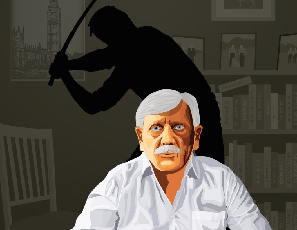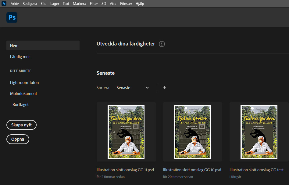 Jag hade ett gammalt Photoshop Elements, vilket är en budgetversion av Photoshop. För att göra bokomslaget köpte jag ett mer avancerat Photoshop. När jag väl lärt mig de nya finesserna kunde jag göra ett förslag till omslag. Men jag behövde en bättre bakgrund till gubben som blir mördad så jag köpte Illustrator. Där gjorde jag bakgrunden och kopierade den. Bakgrunden klistrade jag in i Photoshop.