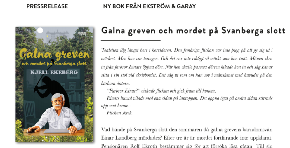 I dag är det två veckor till bokrelease, men det blir ingen releasefest. Ni som känner mig vet att jag inte gillar att gå på fest. Dessutom är det pandemi där ute och en digital fest känns inte roligt. Jag har varit på Zoom-möten och det var alltid teknikkrångel för deltagarna. Jag föreslår att du i stället köper Galna greven och mordet på Svanberga slott från Adlibris eller Bokus och sätter dig i en skön fåtölj och läser boken.