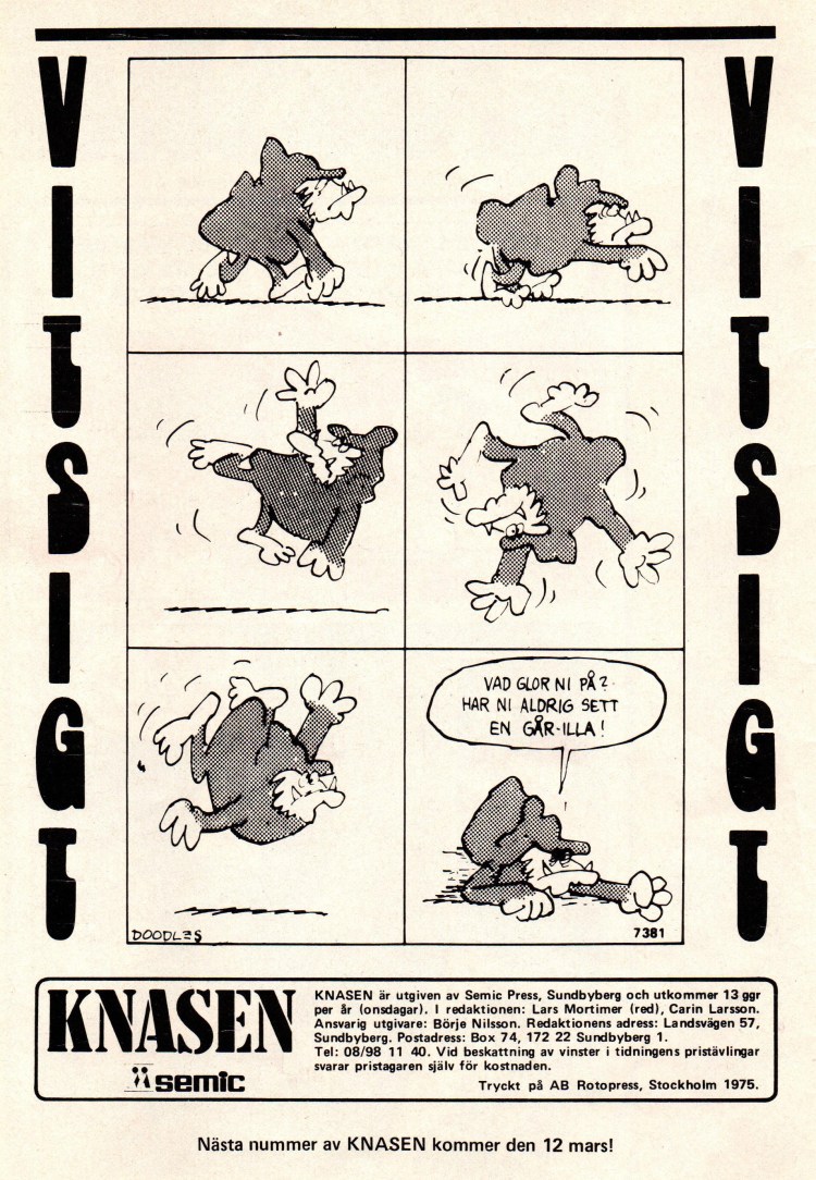 Herrtidningen Lektyr köpte alltid teckningar av mig. De hade inte bara nakna kvinnor utan även ett uppslag varje vecka med skämtteckningar. Annars var det mest fackföreningstidningar, dags- och skämttidningar samt serietidningar jag sålde till. Här en helsida i Knasen: