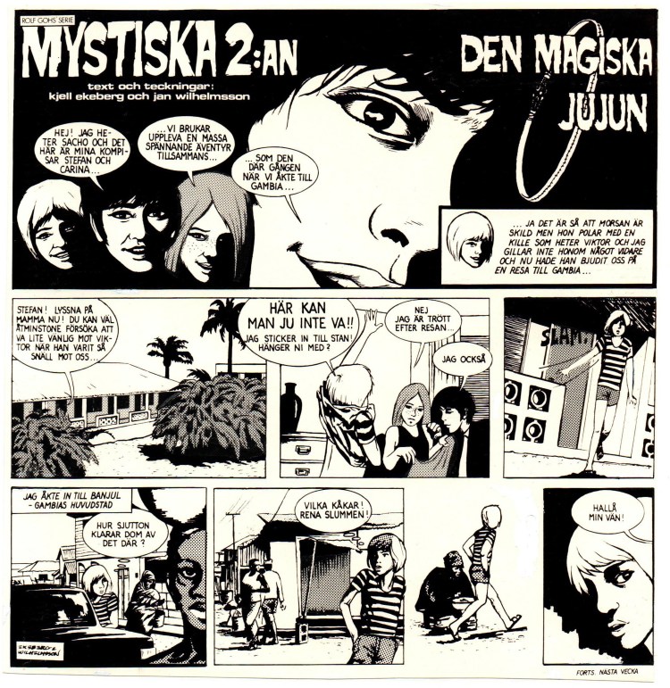 Den 23 augusti 2020 dog serietecknaren Rolf Gohs. Han blev 86 år. Jag träffade honom första gången i början av 70-talet. Vi skulle göra ett grupparbete på teckningslärarinstitutet och jag bestämde mig för att intervjua Rolf eftersom jag tyckte väldigt mycket om hans serie Mystiska 2:an. Rolf hade en ateljé i Gamla stan och där tog han emot mig. Han visade mig hur han jobbade och berättade om sitt serieskapande. Mitt och de andra elevernas bidrag till grupparbetet blev ett tryckt häfte. Tyvärr kan jag inte hitta det häftet nu, men fotona som du ser här är från det tillfället.