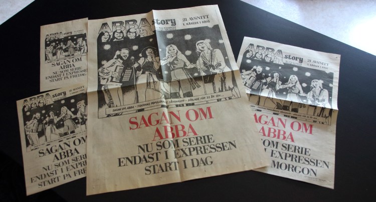 Peter Himmelstrand ringde mig. Han ville att jag skulle göra teckningarna till en serie om Abba som han skulle skriva. Serien skulle publiceras i Expressen där Peter jobbade. Jag var tveksam eftersom Bulls Presstjänst skulle försöka sälja min serie Teddy till dagstidningar. Men jag tackade ja till jobbet och började teckna ”Abba story”. En serietidningssida skulle publiceras om dagen i 21 dagar. När första publicering närmade sig gjorde Expressen reklam för serien med en halvsida. Kul, tyckte jag. Men lite nervöst eftersom jag bara hade ett par sidor helt färdiga. Ännu mer nervöst blev det när Expressen puffade för ”Abba story” med en helsida. Och riktigt kallsvettig blev jag när DN körde en helsidesannons för serien.
