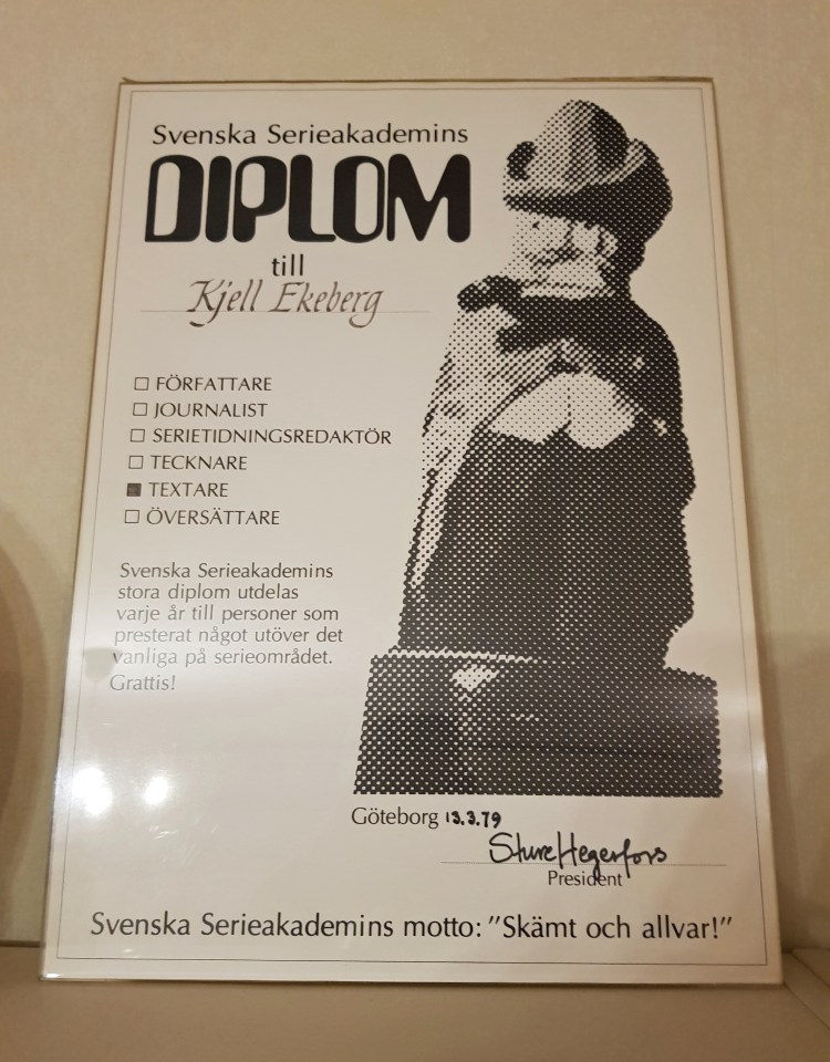 Under utställningen fick jag ett diplom av Svenska serieakademin för att jag textat pratbubblor till serier. Diplomet står numera på en bokhylla i mitt vardagsrum. Jag jobbade mest med att texta seriealbum till serieförlaget Carlsen, men även serietidningar ibland.