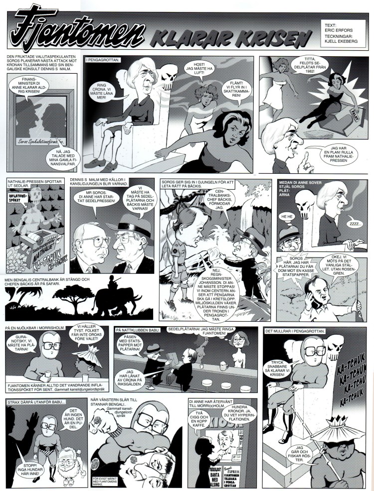 Ledarskribenten Eric Erfors ville att vi skulle göra ledarsidan till en seriesida. Han skrev manus och jag tecknade. Efter publicering blev Eric uppringd av Göran Persson som ville köpa originalet till seriesidan. Det gick inte eftersom den var gjord i min dator. Han fick nöja sig med en signerad utskrift på fotopapper.