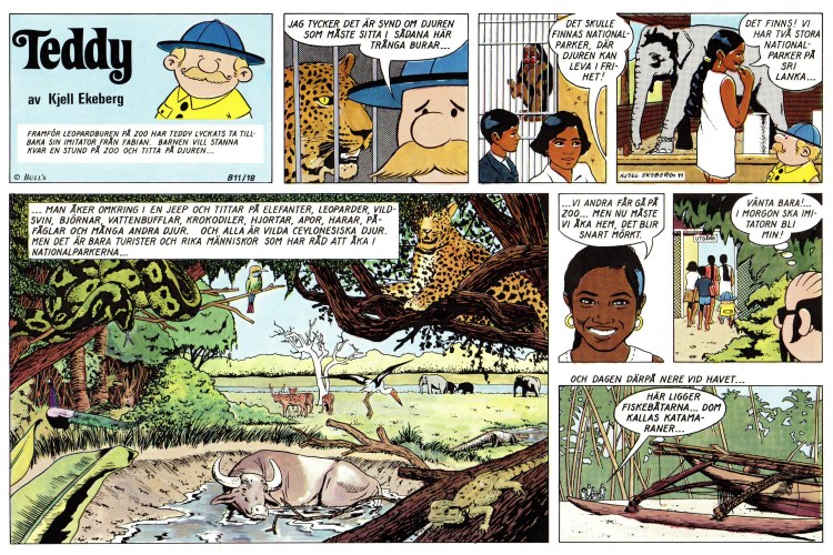 ”Teddy” var en söndagsserie som jag gjorde åt Bulls Presstjänst för att de skulle sälja den till tidningar. Första äventyret utspelade sig på Sri Lanka, där jag varit på semester många gånger. När jag jobbade med ”Abba story” fick jag besked av Bulls att de sålt ”Teddy” till tidningar i Sverige, Danmark och Finland. Första äventyret var klart, men för att inte komma i tidsnöd när serien skulle fortsätta tog jag hjälp med manus av en gammal kompis från tiden på konstskola. Efter Sri Lanka besökte huvudpersonen Teddy Grönland, Skottland och Grekland.